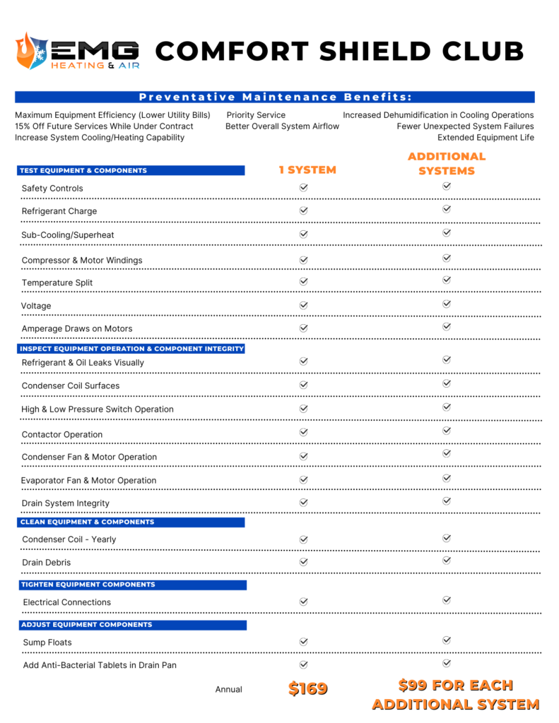 At EMG, we prioritize your needs, ensuring that every space—be it home or business—is consistently comfortable for everyone. Our Preventative Maintenance Club membership offers tailored plans for proactive care of your heating, ventilation, and air conditioning systems. This approach not only maximizes efficiency and reliability throughout the year but also safeguards against unexpected failures, ensuring your peace of mind and maintaining a perfect atmosphere for both personal and professional settings.